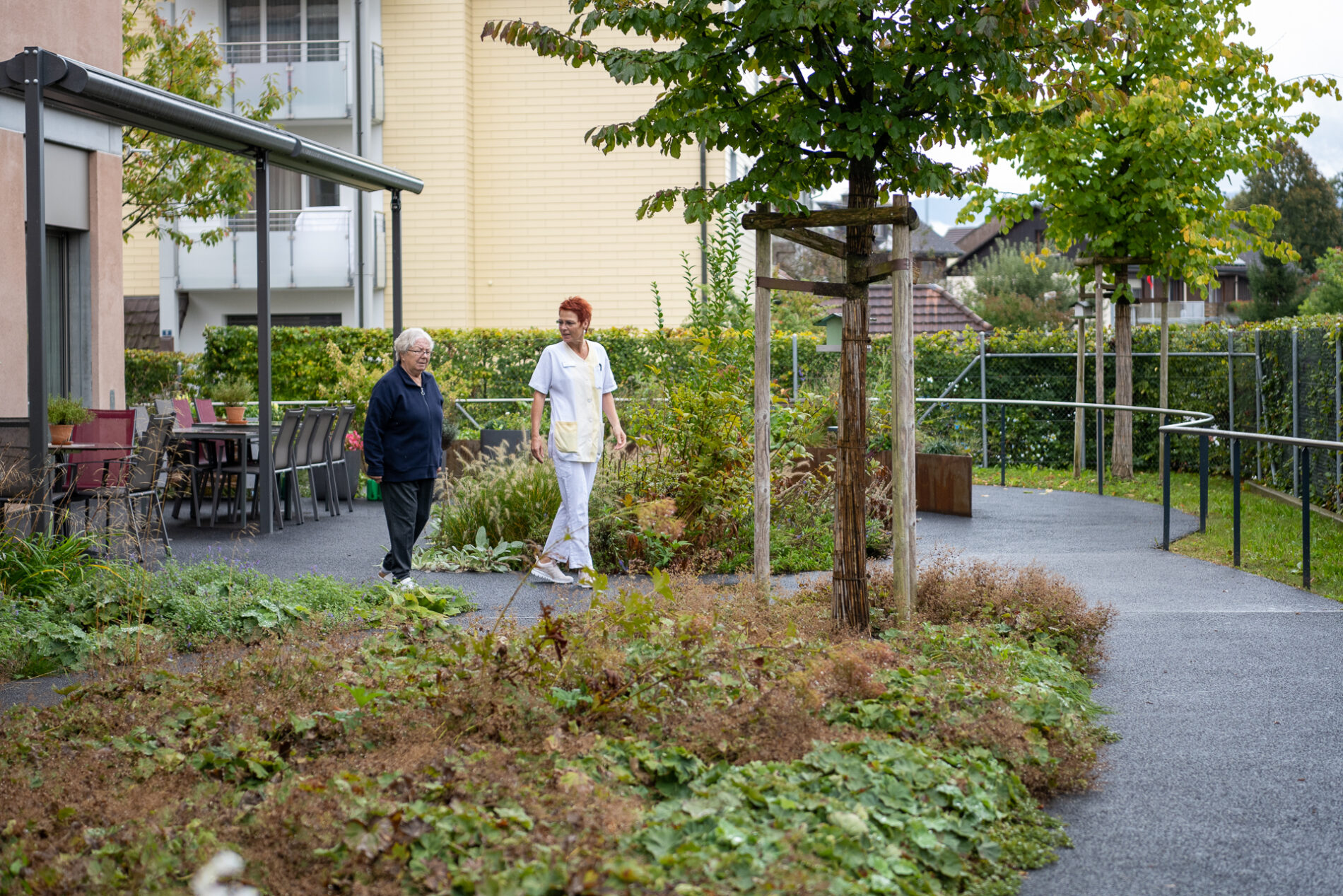 Sowohl Innen- als auch Aussenräume sind sicher gestaltet, um weglaufgefährdeten Personen ein möglichst selbstständiges Leben in sicherem Rahmen zu ermöglichen. Farbgebung, Düfte und Raumstruktur fördern die Orientierung. Sinnesaktivitäten sorgen für angenehme Erlebnisse und stärken das Wohlbefinden.